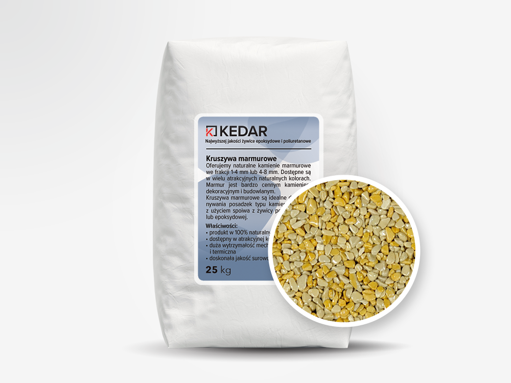 Oferujemy naturalne kamienie marmurowe we frakcji 2-4 mm lub 4-8 mm. Dostępne są w wielu atrakcyjnych naturalnych kolorach. Marmur jest bardzo cennym kamieniem dekoracyjnym i budowlanym. Kruszywa marmurowe są idealne do wykonywania posadzek typu kamienny dywan z użyciem spoiwa z żywicy poliuretanowej lub epoksydowej.