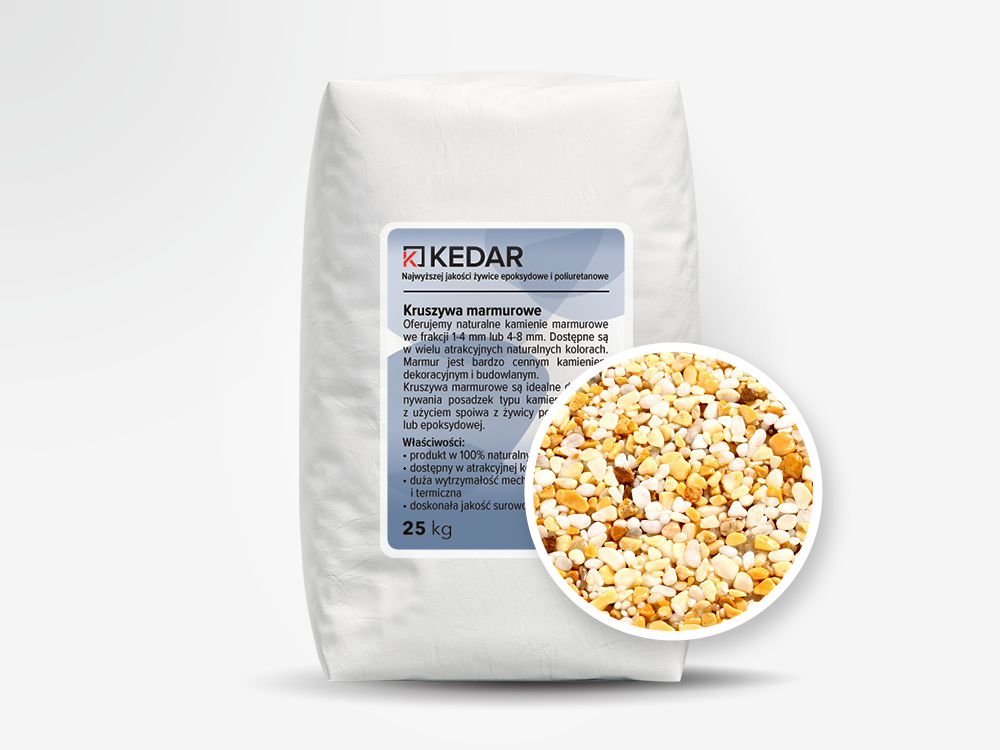 Oferujemy naturalne kamienie marmurowe we frakcji 2-4 mm lub 4-8 mm. Dostępne są w wielu atrakcyjnych naturalnych kolorach. Marmur jest bardzo cennym kamieniem dekoracyjnym i budowlanym. Kruszywa marmurowe są idealne do wykonywania posadzek typu kamienny dywan z użyciem spoiwa z żywicy poliuretanowej lub epoksydowej.