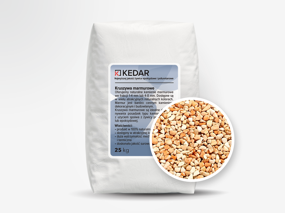 Oferujemy naturalne kamienie marmurowe we frakcji 2-4 mm lub 4-8 mm. Dostępne są w wielu atrakcyjnych naturalnych kolorach. Marmur jest bardzo cennym kamieniem dekoracyjnym i budowlanym. Kruszywa marmurowe są idealne do wykonywania posadzek typu kamienny dywan z użyciem spoiwa z żywicy poliuretanowej lub epoksydowej.