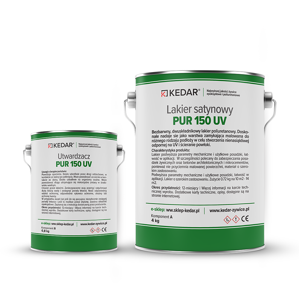 Lakier poliuretanowy satynowy połysk Pur 150 UV stosowany do wewnątrz i zewnątrz. Doskonale nadaje się jako warstwa zamykająca malowana do różnego rodzaju podłoży w celu stworzenia nienasiąkliwej odpornej na UV i ścieranie powłoki. Podwyższa parametry mechaniczne i użytkowe posadzki, łatwość w aplikacji. W szczególności polecany do zabezpieczania posadzek żywicznych do wewnątrz i zewnątrz we wszystkich systemach posadzkowych oraz betonów architektonicznych i mikrocementów, ponieważ nie przyciemnia malowanej powierzchni, materiał o szerokim zastosowaniu. Zużycie 0.72 kg na 10 m2 - 14 m2.