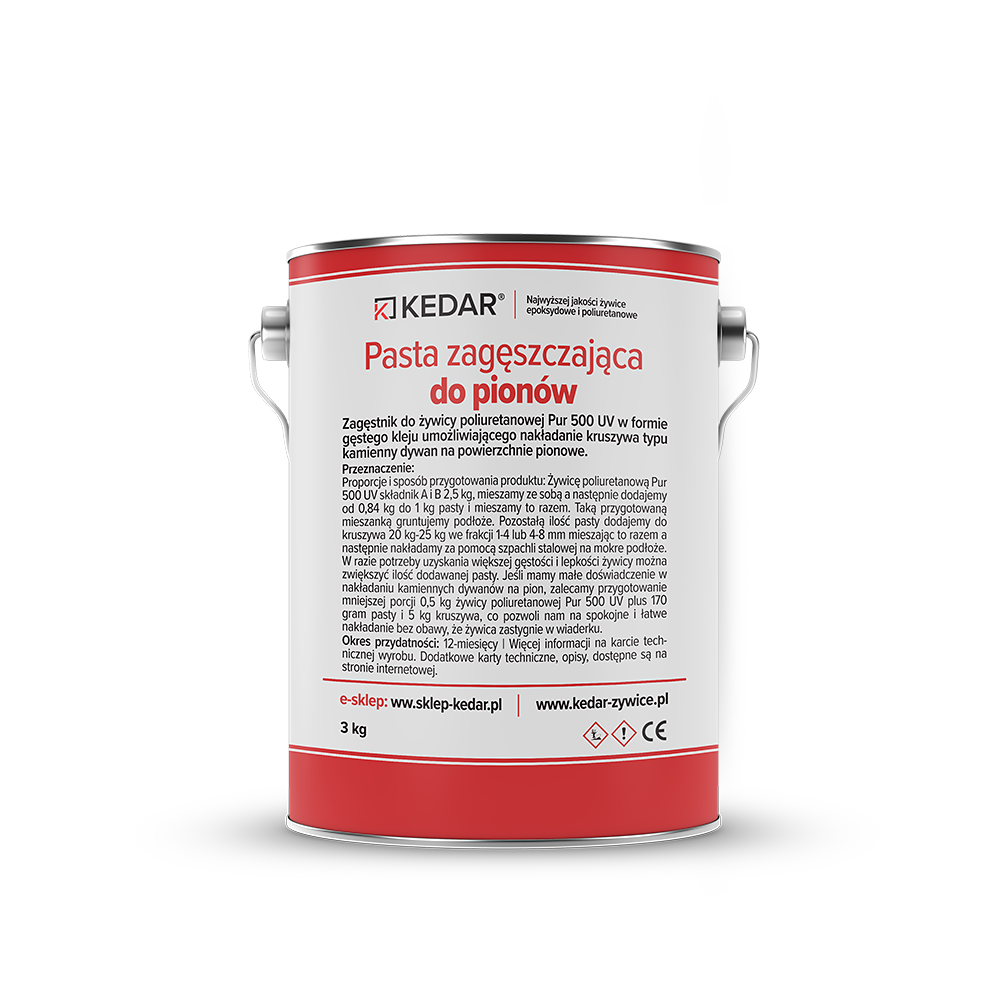 Zagęstnik do żywicy poliuretanowej UV Fast w formie gęstego kleju umożliwiającego nakładanie kruszywa typu kamienny dywan na powierzchnie pionowe. Proporcje i sposób przygotowania produktu: Żywicę poliuretanową UV Fast składnik A i B 2,5 kg, mieszamy ze sobą a następnie dodajemy od 0,84 kg do 1 kg pasty i mieszamy to razem. Taką przygotowaną mieszanką gruntujemy podłoże. Pozostałą ilość pasty dodajemy do kruszywa 20 kg - 25 kg we frakcji 1-4 lub 4-8 mm mieszając to razem a następnie nakładamy za pomocą szpachli stalowej na mokre podłoże.
