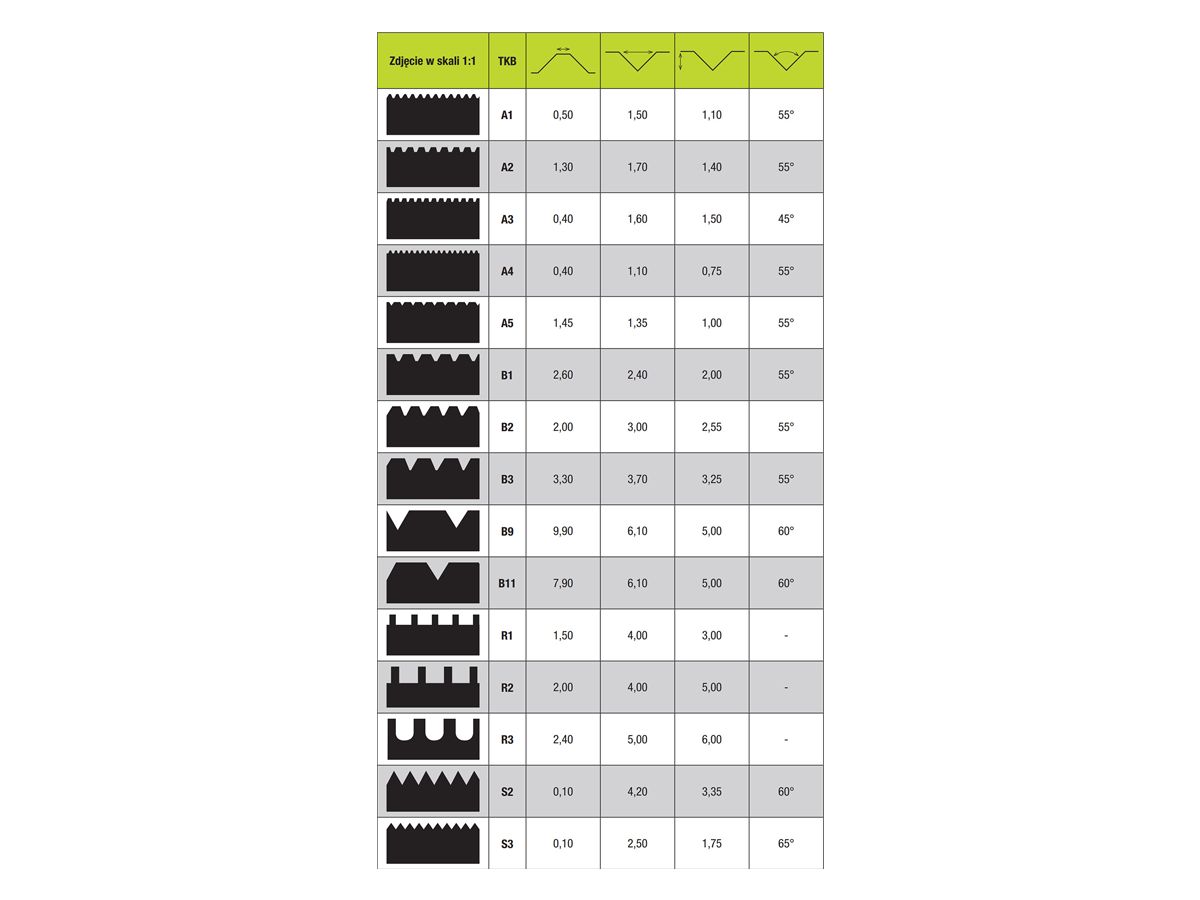 Istnieje możliwość założenia różnej wysokości pasków zębatych w zależności od zapotrzebowania oraz przeznaczenia narzędzia, ostrza przedstawione w tabeli są na indywidualne zamówienie.